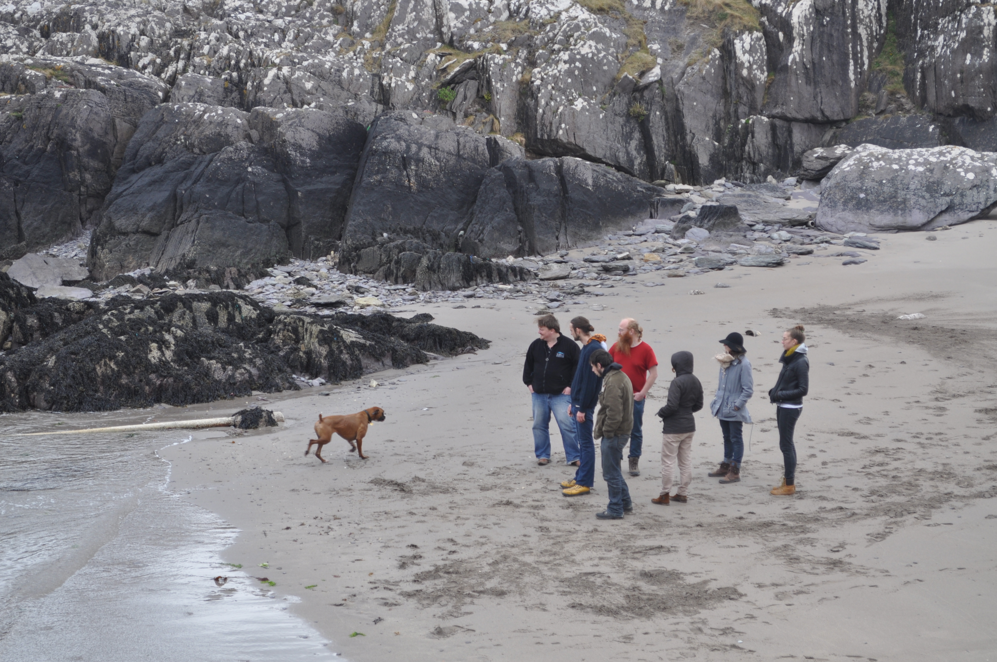 Our little crew watching the pup swim in the cold water.