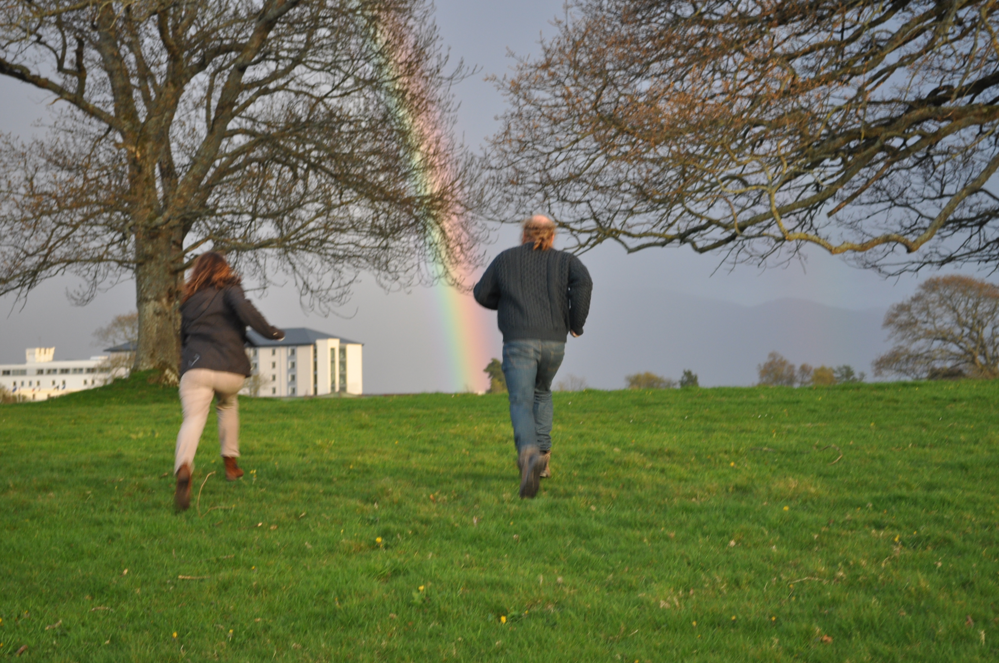 We ask Colm to stop the car so we can take photos, but the rainbow is so bright and clear we just have to try and get to it! Eve, Darren and I run across the street, hop a fence and run through the field towards the rainbow!